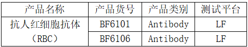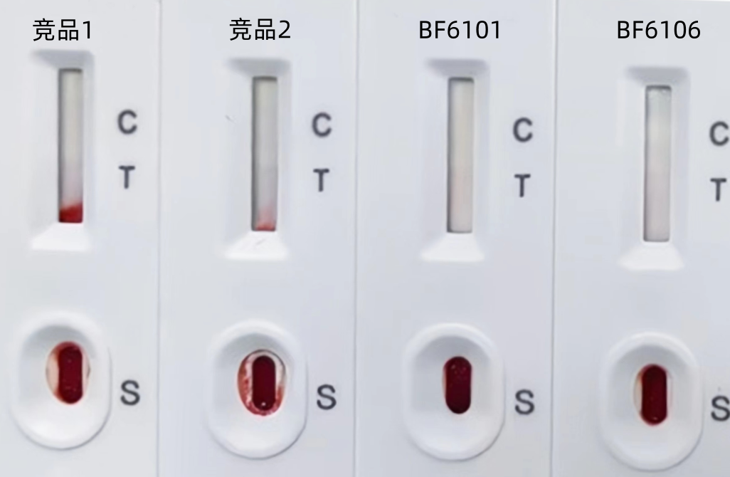 实验结果:在相同实验条件和抗体浓度下,博梵生物生产的两个RBC抗体#BF6101(10R16)和#BF6106(14F8)均能有效阻挡和拦截人血液中的红细胞,检测视窗内未见红色背景,且背景干净、无溶血现象。相较于竞品,本产品在红细胞拦截效率和背景清洁度方面表现更优。